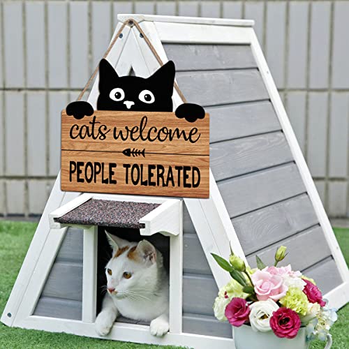 LHIUEM Funny Cat Welcome Sign,Cats Welcome People Tolerated Kitty Kitten Footprint Wooden Plaque,10X11 inches Black Cat Wall Decor, Funny wooden Sign For Pet Shop Home,Cat Lover Gifts